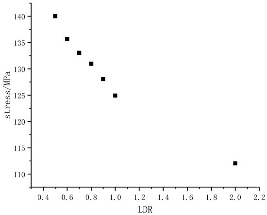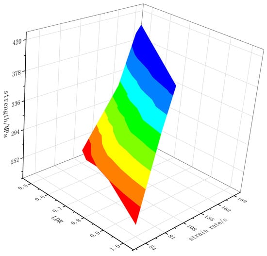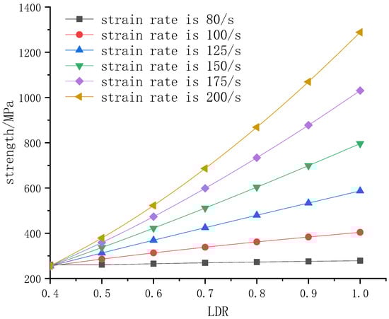 The LDR increased from 0.5 to 1, and the rock strength decreased from 140.02 MPa to 124.924 MPa. The rock strength was inversely proportional to the size, and the decreasing trend of the rock strength becomes weaker with the increase in the size.