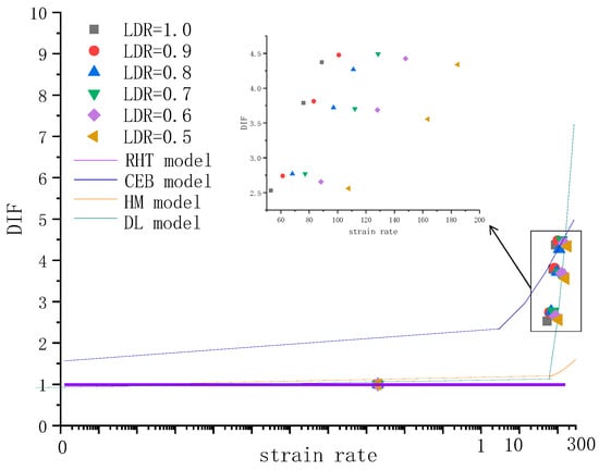There are many quantitative studies on the strain rate effect on rock materials; many fitting models are widely used to illustrate the empirical relationship between strain rate and DIF [,,,]. In Figure 3, the tested DIF was compared with other calculated results from different models. The DIFs calculated by the DL model were better. With the strain rate increase, the DIF increased, which shows the strain rate effect had an obvious influence on rock strength.