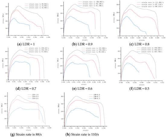 As shown in Figure 4g,h, the strength of different sized specimens was different with same strain rate. These differences show the character of dynamic size effect. The stress–strain curve slope of the larger specimen was steeper than that of the smaller specimen. The linear part of the rising curve was in the elastic stage of the specimen; that is, the dynamic elastic modulus increases with the size increase in the specimen. With the increase in specimen size, the peak stress also increases significantly.