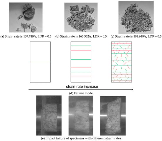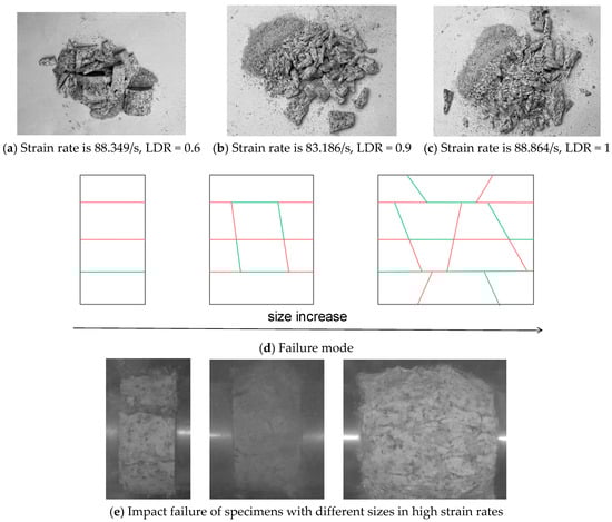 When a specimen is impacted at the same strain rate, the larger the specimen size is, the finer the specimen fragments. The fracture of specimens with a strain rate of about 88/s and height-to-diameter ratios of 0.6, 0.9 and 1 are shown in Figure 6a–c. The three failure modes of the specimens with increasing size are shown in Figure 6d. As the size increases, the number of fragment also increases. Under certain impact conditions, the LDR change can influence the strain rate. When the strain rate is constant in these differently sized specimens, the bigger sized specimens are hit by the larger energy. As shown in Figure 6e, the fragment sizes are also smaller.