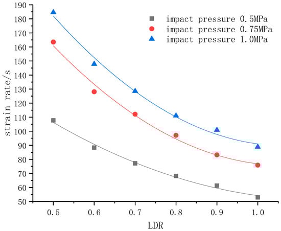 The relationship between strain rate and the size of the specimen is shown in Figure 7. Under the same strain rate, specimens of a larger size correspond to the larger impact load; that is, when a set impact has larger energy, greater energy used for the fracture of the specimen, and the size of the fragments is smaller. Under the same impact conditions, the strain rate decreases as the specimen size increases.