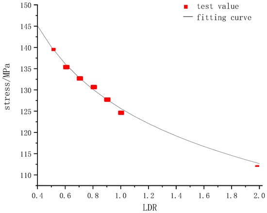 Quasi-static compression tests were carried out on specimens with diameters of 50 mm and length-to-diameter ratios (LDR) of 1, 0.9, 0.8, 0.7, 0.6, 0.5 and 2 at the loading rate of 0.002 mm/s. The corresponding uniaxial compressive strength is shown in Figure 2.