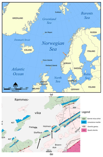 Figure 1. (a). Regional map with the sampling location indicated by the orange arrow (from CC BY-SA 3.0, https://commons.wikimedia.org/w/index.php?curid=292869, accessed on 20 December 2022); (b). geological map of the sampling sites at Stefføya and Valen indicated by the black arrows (from NGU Nasjonal berggrunnsdatabase [48]).