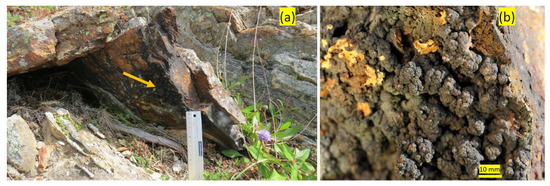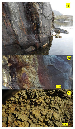 The sampling site at Valen (63°85′69″ N, 9°85′95″ E) is located on the mainland 200 m west of the farm bearing the same name. The landscape is characterized by coastal flats with small hills up to 20–30 m above sea level. The southwest-facing cliffs, approximately 5 m in height, have an inclination of 60 degrees. The vegetation at the top of the cliffs is dominated by Calluna vulgaris heath and small bushes of Juniperus communis and Populus tremula. The sampling site of Valen was at the bottom of two rocks (approximately 1 × 0.5 m) partly intersecting in a V-shaped orientation, creating a free space of approximately 30 cm above the ground in a south–southwest-facing cliff at approximately 3 m above sea level. (Figure 3a,b). The rock on which the jarosite formed is comprised of mica-rich schist and paragneiss. The encrustations found at Valen differ in color (black) and size (larger botryoidal formations) compared to specimens observed elsewhere.