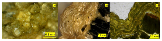 SEM analyses of a sample from Stefføya showed a patchwork of mineralized microbes in the crust (Figure 11b). In preparation for SEM analysis, most of the surface biofilm with living microbes have probably been removed and only fossilized microbes are observed. Reflected light microscopy (white and polarized light) reveals that the freshly collected samples from the mineral crust surfaces contain dark agglomerations (0.01 mm) in the “varnish” layer as well as a network of tread-like structures. Different groups of microorganisms are apparently present as the SEM analyses revealed, including one-celled microbes (bacteria) and scattered filamentous structure. In the present study, it was not possible to decide conclusively whether the organic structures and microbe remnants observed are connected to biomineralization or biologically induced mineralization. Microstructural and morphological features of the jarosite formation, however, point to a possible microbial activity causing the successive depositions of jarosites, followed by their weathering, in cyclic manner over a very extended time frame. Layered accretionary and laminar structures commonly found in stromatolites, that are produced by microorganisms such as cyanobacteria, resemble the repetitive wavy microstructures of the jarosites observed in this study. The repetitive wavy structures are found among the laminar patterns in the formation of the stromatolites.