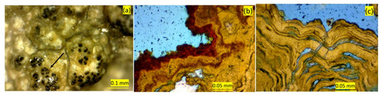 Figure 5. Micrographs of Valen samples: (a) surface of the mineral crust showing botryoidal 199 formations with dark agglomerations (arrow), (b) cross-section of the crust showing lamina and likely formation of iron oxides/hydroxyoxides on the surface as weathering products of the jarosite (dark red material at the surface), and (c) polished thin section showing laminated crust structure. The scale is 0.1 mm in (a) and 0.05 mm in (b,c), respectively.