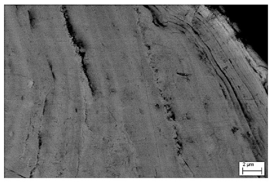 The individual botryoidal formations on the crust surface of the Stefføya samples measure 0.01–0.5 mm in diameter and are aggregated in groups up to 5 mm in diameter. Some of the botryoidal formations at the two locations appear in the polarized reflected light microscopy with dark agglomerations beneath the surface varnish (Figure 4a). Reflected light microscopy shows groups of 1–2 mm long transparent white or yellow crystals on the crust surface, appearing like swallow-tailed structures, possibly composed of gypsum and calcite as indicated by elemental and molecular spectroscopic analyses. Grey-colored tower-like structures (approximately 2 mm high and 0.5 mm wide) with a rim of transparent microcrystals at their top (identified to be gypsum) are also found on the surface as detailed later. Analyses by transmission light microscopy of two polished longitudinal thin sections of samples from Stefføya (Figure 4c) and Valen (Figure 5c) revealed a similar layered crust structure with several smaller lamina inside each layer and increasing porosities in the crust towards the parent rock. The analyses by polarized transmission light microscopy also show a thin distinct anisotropic layer (interference colors) in the outermost parts of the crust surface with several microlamina, each measuring approximately 0.01 mm or less. Back-scatter electron (BSE) images of a thin section from Stefføya confirms the microlamination (Figure 6).