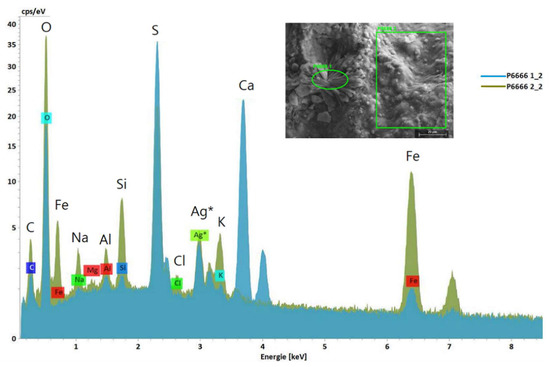 Figure 9. SEM image with selected areas from Stefføya sample for SEM-EDS analyses (inset) and the corresponding overlayered EDS spectra acquired. Jarosite, natrojarosite, gypsum, aluminosilicates and silicates are implied from the elements detected. The oval green area resulted in the light blue spectrum (gypsum) whereas the rectangular area selected gave the olive green one (jarosite, silicates and aluminosilicates). The silver detected is from the coating used to make the sample electrically conductive in the analysis. Larger symbols are used for visibility in addition to the ones generated by the EDS software.