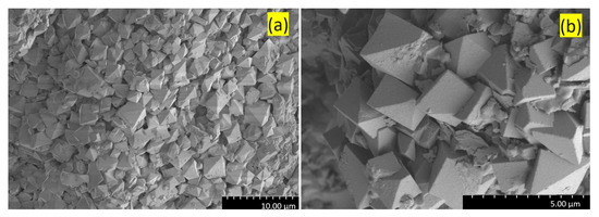Figure 12. SEM images (SE) of the trigonal antiprismatic crystals of jarosite at different magnifications acquired from a Stefføya sample: (a) at lower and (b) higher magnifications.