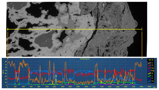 A thin section, cut perpendicular to the crust surface towards the parent bedrock, was subject to line EDS analyses (Figure 13). Despite being low in the scale used, there appears to be relative increments in sulfur, potassium, and sodium where jarosites are located. The distribution of elements shows some patterns in agreement with jarosite distribution. Here, mixed jarosites with both potassium and sodium jarosites could also be implied.