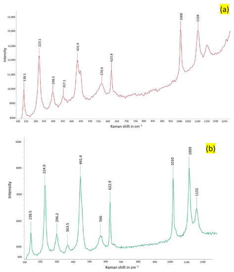 Figure 14. Raman spectra of samples acquired from Stefføya. The first one is composed more of jarosite (a) and the second likely contains more natrojarosite proportion (b). The peaks are similar. The strong bands between 1000 cm−1 and 1110 cm−1 are used for the distinctions.