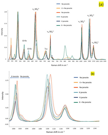 Figure 15. Overlayered Raman spectra of samples from Stefføya along with the peak assignments (a) and the closer view in the range centered around 1000 cm−1 and 1100 cm−1 (b). The suggested compositions are based on the relative shifts in the peaks shown in (b). However, many shifts are also noted in other peaks as displayed in (a). Na-jarosite—natrojarosite; K-jarosite—jarosite.