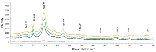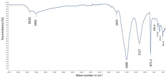 Similar to gypsum, the presence of goethite is also identified by the Raman spectroscopic investigations (Figure 17). The gypsum bands are identified as 1008 cm−1 ν1(SO4), 1141 cm−1 ν3 (SO4), 620.6 cm−1 ν4 (SO4), 493.9.6 cm−1 ν2 (SO4), and 414.4 cm−1 ν2 (SO4) [53,54]. The peaks 242.18, 299.87, 388.76, 554.49. and 683.29 cm−1 belong to goethite: 242.18 cm−1 (Fe-O symmetrical stretching), 299.87 cm−1 (Fe-OH symmetrical bending), 388.76 cm−1 (Fe-O-Fe/-OH symmetrical stretching), 554.49 cm−1 (Fe-OH asymmetrical stretching) and 683.29 cm−1 (Fe-O symmetrical stretching) [55,56]. In some samples, the co-existence of calcite and gypsum is indicated by the results from FTIR analyses (Figure 18). The characteristic bands of calcite are identified at 1400, 871.2, 712.8 cm−1 and agree with similar assignments ([57] and references cited therein). Gypsum peaks are assigned as follows: 3532 cm−1 υ3(H2O), 3402 cm−1 υ1(H2O), 1620 cm−1 υ2(H2O), 1117 cm−1 υ3(SO4), 671.5 cm−1 υ4(SO4), and 601.8 cm−1 υ4(SO4) [58,59].