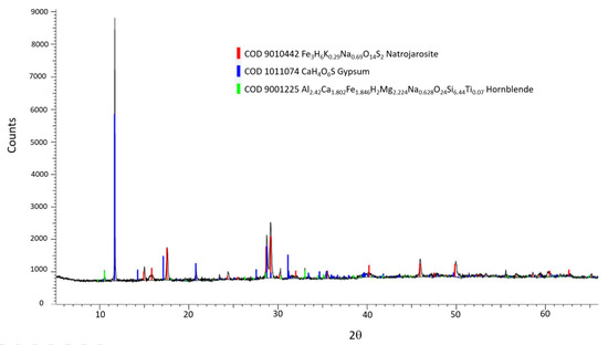 In addition to the characterization of the different types of jarosites in the samples, the weathering products and parts of the rock on which the jarosites were formed (including surface depositions) were investigated using microscopic and elemental methods (SEM-EDS and XRF), molecular techniques such as FTIR and micro-Raman spectroscopy and a mineralogical technique (XRD). Some of the results are shown in Figure 14, Figure 15, Figure 16, Figure 17, Figure 18 and Figure 19. Additional results are also provided in the Supplementary Materials (S1–S5).