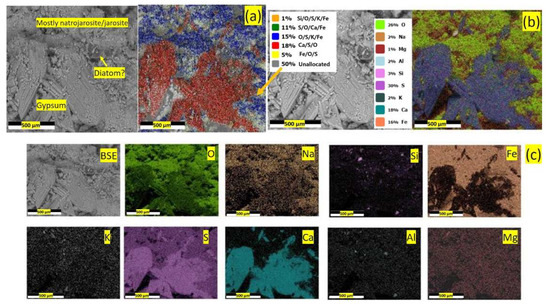 SEM-EDS analysis of a longitudinal thin section cut through a crust sample from Stefføya shows characteristic gypsum crystals inside cavities of the crust as well as several (1–2 µm) trigonal antiprismatic crystals of jarosite (Figure 8, Figure 11a and Figure 12). Jarosite is the most common member of the alunite supergroup and belongs to trigonal structure. The gypsum formation could be related to the weathering of jarosite, where the sulfate released forms gypsum upon contact with calcium-rich microenvironment.
