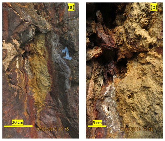 Figure 25. Additional examples of jarosite formations and their weather products in proximity to the holes and cracks in the rock at Stefføya. The image to the right (b) is a closer view of one of the holes visible on the rock surface (top left in (a)). The visible part of the reference ruler length in (a) is 11.5 cm long.