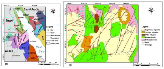 Location of the study area. (a) Sketch map of the main terranes, major suture, and shear zones of the Arabian-Nubian shield in the Red Sea Hills Region of Sudan (modified after Bierlein et al. []); (b) geological map of the study area (modified after Mohamed et al. []).