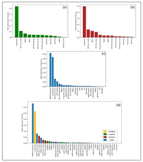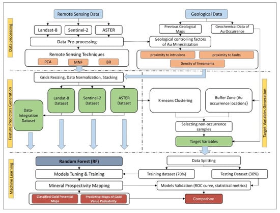 Although remote sensing data were utilized in several studies for mapping mineral potential using supervised learning models, they have not been used as the main core for the derivation of the evidential features to train ML data-driven predictive models (e.g., RF, SVM, and ANN). For instance, Mansouri et al. [] processed ASTER data with a multivariate regression analysis method to map iron mineral resources in the Sarvian area, Iran. Moreover, three multispectral data, namely Landsat-7 ETM+, Landsat-8, and ASTER were utilized by Bolouki et al., [], to produce several predictor maps (evidential features), then were fused together to train Naïve Bayes (NB) classifier for producing a map showing the probability of gold occurrence in Ahar-Arasbaran area, NW Iran. On the other hand, remote sensing imagery was integrated with other sources of data to train various ML predictive models. As an example of that, two band ratios (BR) images of Landsat TM (5/7 and 3/1) were integrated with other predictor variables such as three geochemical survey maps and a couple of geophysical maps. Rodriguez-Galiano et al., used these two BRs as an indication for ore-related hydroxyl and iron oxide alteration to train RF model for gold MPM in Rodalquilar area, Southern Spain [].