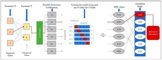 In common practice, leave-out and cross-validation methods are utilized to assess model performance []. The leave-out approach is achieved by randomly splitting the target variables into training and testing subsets. Data split usually takes different portions according to the user’s definition when it typically is carried out at 75:25 or 80:20. On the other hand, the cross-validation approach, namely K-Fold cross-validation method, employs all the target data in the training and testing process simultaneously. This is achieved by splitting the data into k subsets, where each subset serves once as a testing set while the remaining sets are used to train the model. This process is repeated k times until all of the target data appear in the training and testing set. This method, thereafter, averages the scores of the prespecified accuracy metric from each k fold performance. Since the study focuses on regression task, the mean square error (MSE) was utilized to measure the average squared difference between the trained model predicted result () and the true value of each sample (). This can be formalized as follow: