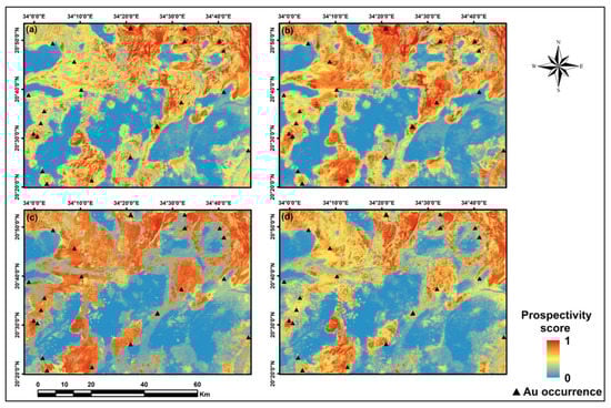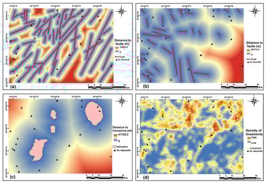 According to the primer understanding of gold mineralization controlling factors, and geological data availability as well, we produced four geological-based predictor maps by using GIS spatial analysis methods. Identifying permissive lithologies, structures, and hydrothermal alteration zones is the main criterion of exploration. From prior literature about the Red Sea Hills, it is well known that mineralization zones have the same linear structures and exist in the acid meta-volcanic rocks [,,]. Faults/fractures are favored channels for fluid migration, which represent the main ore-controlling factor in shear zone-related gold deposits. Therefore, two maps of distance to NE- and NW- faults were generated by using the Euclidean distance method (Figure 4a,b). The contact zone of the intrusive rocks (older and younger) lies in meta-sediments and metavolcanics, which may indicate the spatial agreement with gold mineralization in Hamissana area. Moreover, younger intrusions in the study area are highly sheared and contain several dykes. Hence, the proximity to outcropped intrusions was employed as a predictor map (Figure 4c).
