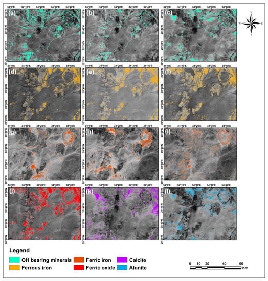 BR images derived from different sensors showing various targeted minerals in colored pixels (a–c) Hydroxyl-bearing minerals derived from Landsat-8 (6/7), Sentinel-2 (11/12), and ASTER (4/6), respectively; (d–f) Ferrous iron minerals derived from Landsat-8 (7/5 + 3/4), Sentinel-2 (12/8a + 3/4), and ASTER (5/3 + 1/2), respectively; (g–i) Ferric iron minerals derived from Landsat-8 (4/2), Sentinel-2 (4/3), and ASTER (2/1), respectively; (j) Ferric oxide minerals derived from Sentinel-2 (11/8a); (k,l) Calcite and Alunite minerals derived from ASTER BR 4/7 and 4/5, respectively.