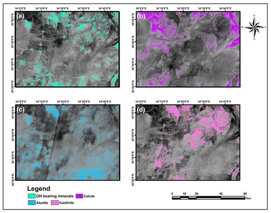 The mineralogical indices images derived from ASTER SWIR bands show the spatial distribution of targeted minerals in colored pixels: (a) OHI; (b) CLI; (c) ALI; (d) KLI.