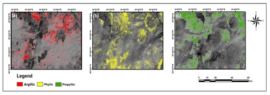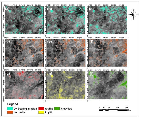 For more details about argillic, phyllic, and propylitic alteration zones, PCA method was also applied specifically to ASTER data. Table 7 shows the eigenvector loadings for argillic using bands 1, 4, 6, and 7, phyllic using bands 1, 3, 5, and 6, and propylitic using bands 1, 3, 5, and 8. The argillic zone has reflectance spectral features in bands 1 and 6, and absorption ones in bands 4 and 7 []. Subsequently, most loadings that correspond to this typical spectral feature are found in PCA 4, although the loadings are weaker in band 1 (−0.025) and band 4 (0.133) compared with band 6 (−0.767) and band 7 (0.631). PCA4 is selected to map phyllic alteration zone since it shows loadings with opposite signs in band 5 (−0.694) and band 6 (0.707). Thus, this loadings pattern corresponds to the assumption that band 5 could be considered as a reflection band since the absorption of muscovite mineral (typical mineral reveals phyllic alteration) is lower in band 5 than in band 6 []. Then PCA4 image of phyllic alteration was negated because band 5 has negative loading. PCA3 loadings in the eigenvector matrix of propylitic alteration, correspond to the calcite spectral properties. This PCA shows strong negative loading in band 5 (−0.722) and strong positive loading in band 8 (0.563). In this case band 5 was treated as a reflectance band because Fe, Mg-oh group has a lower absorption feature in band 5 compared with the strong absorption in band 8. Therefore, this PCA imagery was also negated. As seen in Figure 8g–i, PCA images are significantly different from those derived by RBD method. The surface abundance of the PCA images is much lower and the spatial distribution is almost different than RBD images.
