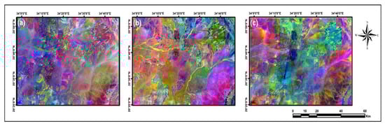 MNF results: (a) Landsat-8 MNF3, MNF4, and MNF5 in RGB.; (b) Sentinel-2 MNF2, MNF3, and MNF4 in RGB.; (c) ASTER MNF2 (negated), MNF3, and MNF 4 in RGB.