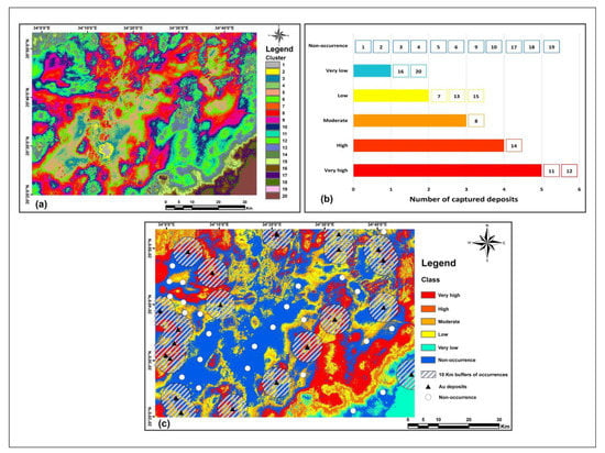 Figure 10a shows the twenty clusters derived from applying k-means on ASTER dataset. As displayed in Figure 10b, the highest frequency is found to be 5 samples per cluster, which takes place in clusters 11 and 12. These two clusters were then classified as the very high prospective class. Clusters 14 and 8 captured four and three Au occurrence samples, respectively, so they were labeled as high and moderate classes. Each one of clusters 7,13, and 15 captured 2 occurrences, which were afterward combined to form the low prospective class. In the meantime, the pattern of one occurrence per cluster is found in clusters 16 and 20, which were defined as the very low prospective class. Finally, the rest of the clusters were classified as the non-prospective class, since none of the Au occurrences is spatially associated with these clusters. Figure 10c illustrates the selection of 25 non-occurrence points following the results of classifying k-means outputs, as well as the criteria described earlier in the methodology section.