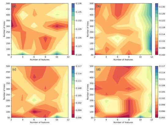 This study uses both approaches for assessing performance and reducing overfitting. The train-test split method was utilized to introduce possible bias since there is limited target data. Moreover, this method aids in comparing the performance of various outputs of RF by measuring accuracy metrics from the testing dataset. On the other hand, the purpose of employing five K-Fold cross-validations is to reduce overfitting and obtain optimal parameters for training each dataset. The possibility to find an optimal combination of parameters varies with different input datasets. Therefore, an objective grid search method known as “GridSearchCV” was used for hyperparameter tuning. This method is provided by the Scikit-Learn library (https://scikit-learn.org). As shown in Figure 3, this method searches through all possible combinations of parameters using k iteration for each combination. The user defines a dictionary of the possible set of values for each parameter whether they are categorical or numerical (e.g., number of trees). Although this process has a high computational cost, it is vital to measure the influence of model configuration on prediction performance. In the present study the range of the number of trees was set between 50 and 500 at intervals of 50, and the number of features between 2 and 12 at 2 intervals [,,,].