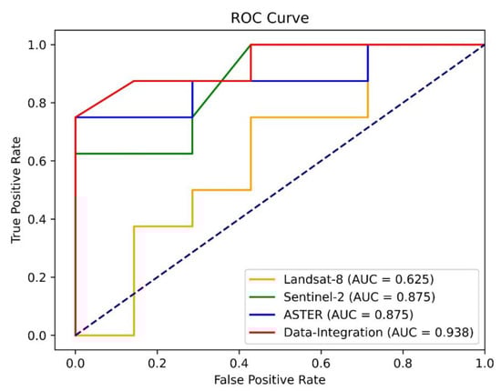 As it is demonstrated by the comparison results and discussion, we conclude that Sentinel-2 and ASTER multispectral data have greater potential for mineral prospectivity modeling than Landsat-8. Both datasets achieved 0.875 AUC, while the overall classification accuracy of ASTER dataset (73.3%) is higher than Sentinel-2 (66.7%). Data-integration dataset boosts the prediction performance of RF up to (AUC: 0.938). The density of the lineaments plays a significant role in the prediction performance in all datasets.
