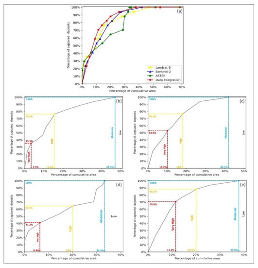 Furthermore, the overall predictive performances of different datasets were compared using the success-rate curve and receiver operating characteristic (ROC) curve [,]. The success-rate curve was created by plotting the percentage of correctly classified gold (true positive rate “TPR”) against the area percentage of prospective regions that are generated by reclassifying MPM using moving threshold values []. Subsequently, the optimal goal of the model is to capture as many mineral occurrences as possible in the smallest possible prospective area. This method is very useful in delineating or classifying different prospective regions (high, moderate, low), by identifying the change in curve slope. Since the success-rate curve only depends on the TPR, the ROC curve was created to also consider the false positive rate (FPR). In the ROC curve, TPR and FPR are plotted against each other on the y-axis and x-axis, respectively. In addition, the predictive performance can be measured by calculating the area under ROC curve (AUC), where the better model performance is indicated by how closer the curve can be to the upper left corner [,,].