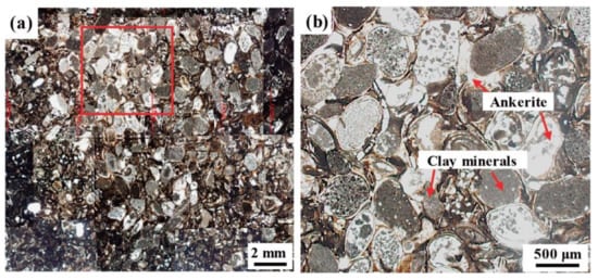The ostracod layer is mainly composed of ostracod shells, detrital quartz, and clay minerals. Most ostracods are well preserved in oval features with 0.7–1.2 mm for the long axis and 0.3–0.8 mm for the short axis (Figure 3). Their body sizes are similar to the previously reported Triangulicypris torsuosus Netchaeva and Triangulicypris torsuosus Netchaeva. nota Ten occurred in the K2qn1 []. As shown in Figure 3, most ostracods are filled with carbonate minerals and/or clay minerals, accounting for about half-and-half in observed area.