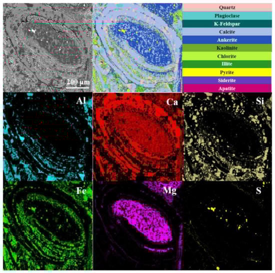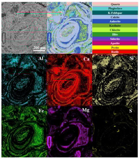 Elemental and mineralogical distributions of two types of ostracods filled with chlorite and ankerite were further investigated by using QemScan. Both of them show concentric mineralogical distribution inside (Figure 5 and Figure 6). The co-enrichment of Fe, Ca, and Mg represents ankerite. The co-enrichment of Al, Si, Mg, and Fe is consistent with chlorite. Pyrite (FeS2) is characterized by the co-enrichment of Fe and S. Quartz (SiO2) is characterized by extreme enrichment of Si. The QemScan data give more refined mineral distributions and are consistent with the optical observation (Figure 3 and Figure 4). For the ostracod filled with ankerite, the chlorite inside is mainly adjacent to the shell (Figure 5). Conversely, when the ostracod is filled with chlorite, ankerite is the dominating secondary mineral and distributes along the shell edge (Figure 6). A small amount of siderite was also identified in this type of ostracod (Figure 6). Small amounts quartz with poor roundness can be identified on the calcified shells (Figure 5 and Figure 6). It should be noted that pyrite is rare in both two types of ostracods and is mainly associated with ankerite (Figure 5 and Figure 6).