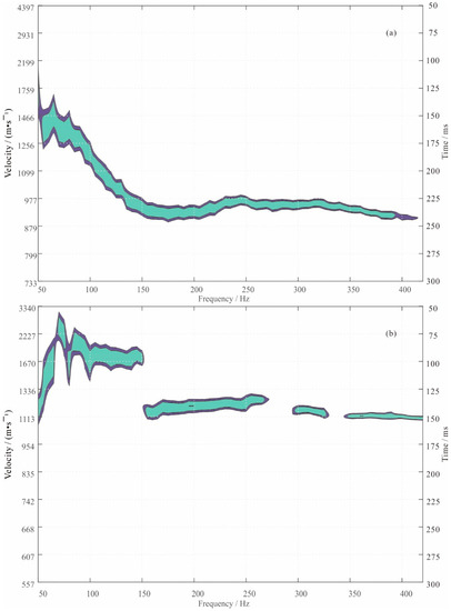 A dispersion curve can be extracted from the transmitted waves received in the underground roadway using narrow band filtering or wavelet transformation. When the transmitted channel wave does not pass through abnormal bodies, the dispersion curve is a continuous smooth curve, close to the theoretically calculated dispersion curve, as shown in Figure 1a. When the transmitted channel wave passes through abnormal bodies, the dispersion curve appears to be intermittent and is an irregular variation curve, as shown in Figure 1b. The velocity in the figure is the ratio of the ray path length to the travel time; thus, the distribution of the velocity values is unequal [35].