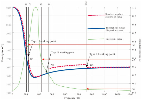 The three breaking points (N1, N2, N3) in the figure correspond to the three types of breaking points. N1 corresponds to the first type of breaking point and corresponds to two frequencies, f1 and f2. The maximum value in the normalized amplitude of f1 and f2 in the spectrum curve is the weighting factor w1. Similarly, the weighting factors w2 and w3 corresponding to the breaking points N2 and N3 are obtained. That is, the maximum value in the spectrum corresponding to the two frequencies and in the ith breaking point of the actual dispersion curve is the weighting factor for that breaking point. From the spectrum curve, the main frequency of the channel wave , and and , which are 0.1 times the amplitudes of the main frequency, are obtained. The difference between them is the spectrum band.