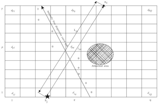 where is the theoretical calculated value of the dispersion curve variability of the channel wave at the jth source point and the kth receiver point, is the length of the channel wave path at the jth source point and the kth receiver point, is the length of the grid point in row p and column q through which the channel wave at the jth source point and the kth receiver point passes, and is the value of the grid point variability in row p and column q.