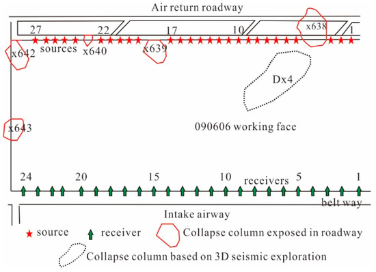 The above method was applied to a channel wave detection example. The work area of the channel wave seismic detection is a Mine 090606 working face (Figure 4) that has a stable coal seam thickness of 4.1–4.3 m. The working face roadway revealed five collapse columns in Figure 4 marked with red circles, plus one collapse column determined from 3D seismic speculation in Figure 4 marked with dotted line. The abnormal body detection target is the collapse column. According to the detection task, 27 source points and 24 receiver points were set up in the upper and lower lanes of the working face, respectively, with the source point distance being 10 m and the receiver point distance being 15 m. SUMMIT-II channel wave seismic recording and double-component velocity detectors were used for the receiver.