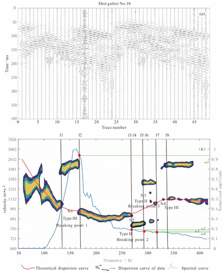 Direct P-wave, S-wave, and channel wave signals can be identified from the seismic records (Figure 5a). Dispersion analysis and spectral analysis of the channel waves were conducted by the dispersion curve variability method to determine the type of breaking point and its weighting factor in the spectral curve (Figure 5b). For the theoretical dispersion curve calculation, a smooth and continuous dispersion curve from the actual channel seismic record was used (Figure 5b red curve). In Figure 5b, the fa is 110 Hz, fb is 410 Hz, and the F is 300 Hz, the V is the S velocity, 2600 m/s. The path length is 198.8 m (shot No. 10 with receiver No. 18), and the variability parameters for the nth trace of the nth source are shown in Table 1.