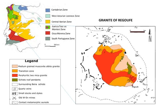 The Regoufe granite is a small pluton with an outcrop extension of approximately 6 km2 with a slightly elongated circular geometry in an NW-SE direction. The granite presents a medium to coarse-grained porphyroid texture, mainly muscovitic, with the presence of scattered potassium feldspar megacrystals. The matrix is composed of feldspar, quartz, and muscovite showing a light color. The orientation of the feldspar megacrystals develops an NW-SE magmatic foliation which may suggest tectonic control during the installation of the granitic body. Tourmaline is a very common accessory with a few millimeters in length and black color; also, locally and dispersed, arsenopyrite crystals are observed surrounded by a halo of alteration [33]. The final stages of granitic intrusion were characterized by the circulation of hydrothermal fluids that allowed the precipitation of W-Sn minerals in quartz veins. These processes also produced the alteration of granite and metasedimentary rocks [34,35].
