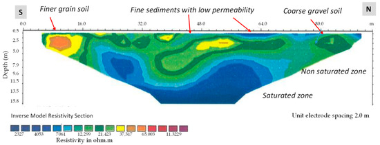 In the case of the profiles in the central part of the valley or in the areas close to the galleries, the influence of the presence of water is remarkable. As observed in the laboratory tests, the electrical response is mainly conditioned by water saturation, so in the cases of profiles PE3, PE5, PE8, and PE9, it was not possible to differentiate the material present in the subsurface and it was only possible to analyze the results with respect to the groundwater ionic potential. As an example, the profile PE1 shows three intervals with quite distinct electrical responses observed. A shallow zone (depths below 5 m), where the northern zone appears less resistive consistent with a heterogeneous zone with the presence of coarse gravels (relatively high resistivity between 12,000 and 21,000 Ωm) and finer sediments with low permeability and high-water saturation (resistivity between 3000 to 7000 Ωm) (Figure 4). At the same time, the southern zone presents fine material, with good sorting and high permeability, with high electrical resistivity (between 25,000 and 65,000 Ωm). An intermediate zone (depths between 5 m to 11 m) shows lower resistivity than the shallow zone and are interpreted as higher water saturation levels (between 4000 and 25,000 Ωm) is probably associated with the non-saturated zone. Finally, a deeper interval, with the lowest resistivity range (between 1000 and 4000 Ωm) is likely associated with the saturated zone.
