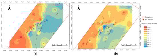 Relative electrical conductivity (EC) maps for: (a) Horizontal component dH (research depth to 3 m); (b) Vertical component dV (mS/m) (research depth up to 6 m).