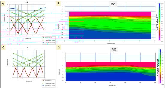 The results for seismic profiles PS1 and PS2 are illustrated in Figure 6A,C, respectively. Seismic waves with different velocities were identified, i.e., direct waves (red lines), two refraction interfaces in the case of profile PS1 (green and blue lines), and only one refraction interface in the case of profile PS2 (green lines). Once the velocity selection is validated, an initial 2D model of layers along the profile is generated. From this initial velocity model, a tomographic inversion process is performed in order to obtain a 2D profile, which honors the arrival time data and minimizes the errors for the constructed grid. In this case, 10 layers and a maximum depth of the PS1 profile of 20 m and for the PS2 profile of 12 m were defined. The p-wave velocity modeling results for profiles PE1 and PE2 are illustrated in Figure 6B,D, respectively.