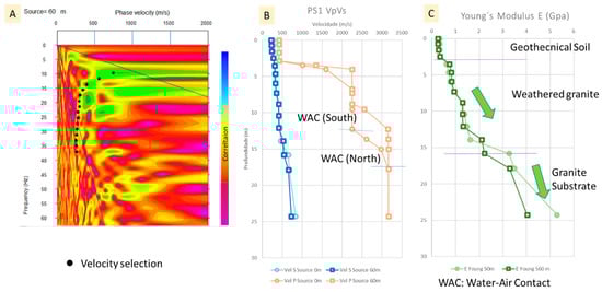 For profiles PS1 and PS2, two dispersion curves are obtained for both the source at 0 m and 60 m. In the last step, the vertical “s” wave velocity profiles are obtained by inversion modeling based on the data and optimizing the initial layer model. In this process, the following parameters are set: the number of layers and the maximum depth of the model. Figure 7B shows the 1D model results from MASW, particularly “s” wave velocity for 0 and 60 m of profile PS1, as well as “p” wave velocities (obtained from the seismic refraction inversion model). For comparison purposes and to evaluate the subsoil mechanically, an estimation of Young’s modulus E was carried out based on the “p” and “s” wave velocity data (extracted from seismic refraction and MASW inversion models, respectively), as well as the density of the material. In the case of density, values taken from the literature [40] were used. In this case, 2 gr/cc for the mine landfill soil and 2.6 gr/cc for the granitic substrate.