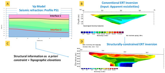 Input data and methodology used to perform an inversion of the structurally-constrained ERT inversion. (A) Definition of interfaces 1 and 2 with higher p-wave velocity contrast. (B) Input data of apparent resistivity (C) Topographic information and (D) Result of Profile PS1 using structurally-constrained ERT inversion.