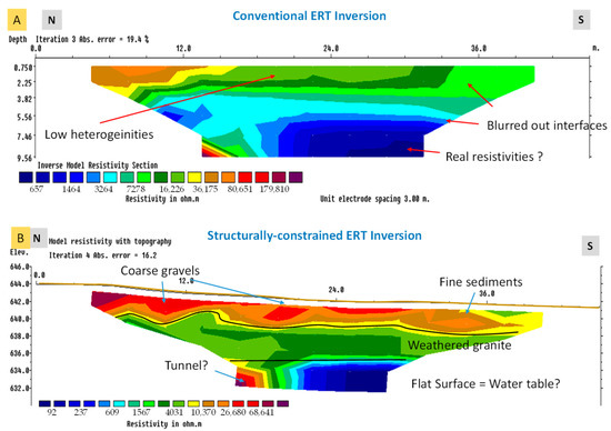 The results of the structure-controlled inversion improved the conventional inversion process (Figure 9) since the boundaries in the latter appear blurred out and with low resolution (Figure 9A) so that the electrical properties of the layers can appear shifted and with smoother values.