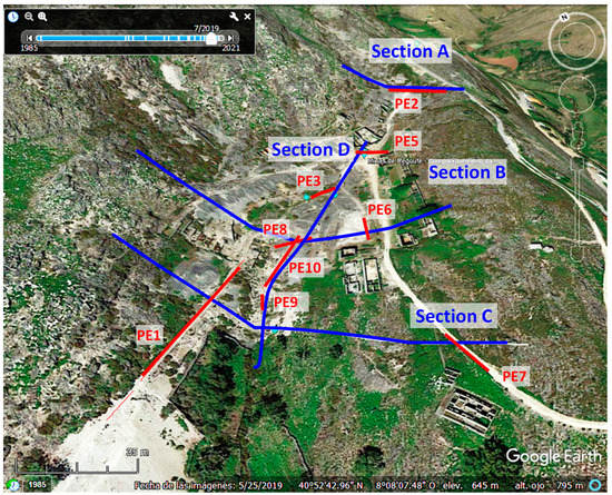 The electrical profiles used in this study combine different surveys carried out between 2017 and 2022 in different seasons of the year (Figure 3). The PE1 (Figure 4) and PE2 (Appendix A) profiles are the longest and deepest in this study, and 48 electrodes were used arranged using Wenner-type geometry with spacings of 2 m for the PE1 profile and 1.25 m for the PE2 profile. Both PE1 and PE2 covered a more extensive zone in the western and northeastern parts of the mining area, respectively. The remaining profiles are shorter and shallower, as their purpose was to assess the potential for contamination in the gallery areas and mine tailings zones with spacing between 1.5 and 3 m and lengths between 22.5 and 45 m. These profiles were conducted to evaluate soils in pile zones (PE3, PE8, PE9, and PE10, Appendix A and Appendix B), zones near gallery exits (PE5, Appendix A), reference zones with an outcropping of granitic zones (PE7, Appendix B) and disposal of materials in zones relatively far from the galleries (PE6, Appendix B).