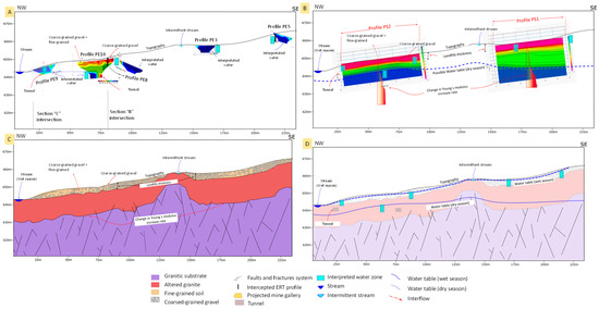 Hydrogeological interpretation process in Section “D” (see map location in Figure 9): (A) Data used and calibrated with surface observations (ERT profiles); (B) Seismic profiles results for PS1 and PS2 profiles (2D “p” wave velocity model and average Young’s Modulus E); (C) Geological interpretation; (D) Hydrogeological interpretation.