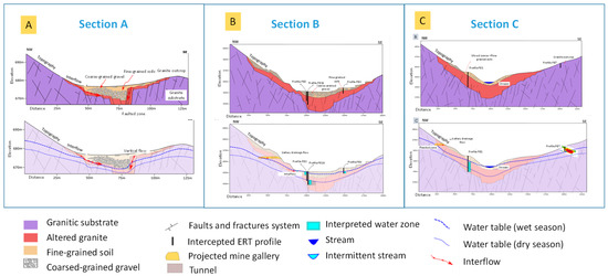 Geological and hydrogeological sections for wet and dry seasons respectively for (A) Section “A;” (B) Section “B;” (C) Section “C”. (See map location in Figure 11).