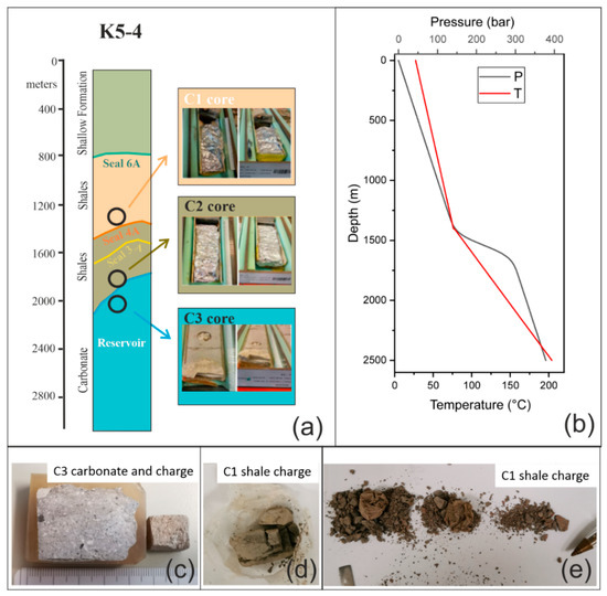 (a) Simplified stratigraphic log of the selected structure with cores location and housing. Depths (m) are referred to sea level. (b) Geothermal and geobaric gradient as measured in drilled wells; (c) carbonate C3 sample as its original form (larger block) and related charge after experiment (smaller cube); (d) shale C1 sample after 2 days of experiment; (e) shale C1 sample after 5 days of experiment.